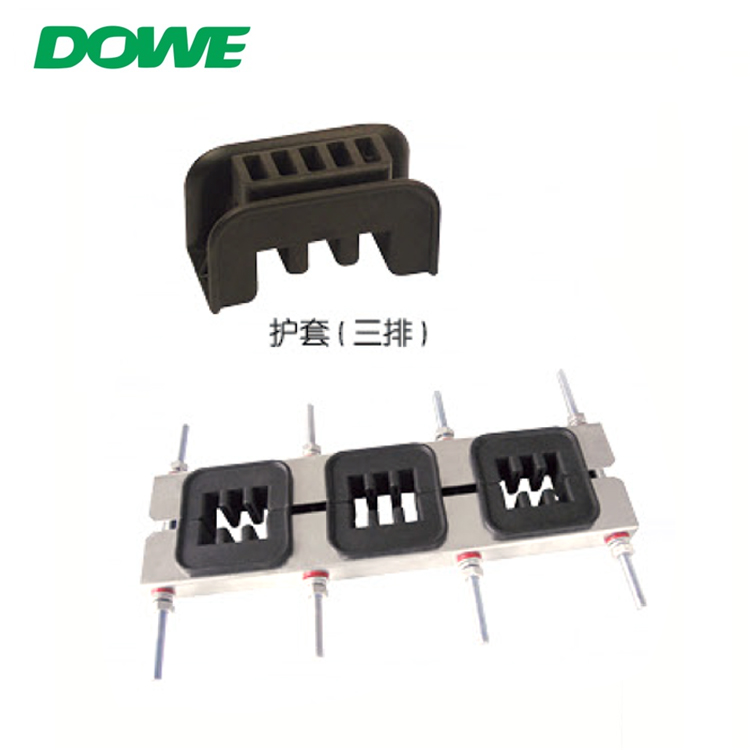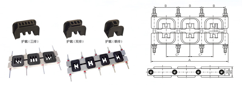 組合式護(hù)套母排夾由金屬支架、塑料護(hù)套、塑料墊圈等組成。塑料護(hù)套嵌入金屬支架內(nèi)可用兩頭螺桿、上下螺帽調(diào)節(jié)銅排寬度尺寸,塑料墊圈可以防止母排電源磁場(chǎng)環(huán)行作用。