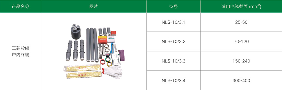 10KV三芯冷縮電纜附件系列產(chǎn)品,適用于3.6/6、6/10、8.7/10、8.7/15kV三芯聚乙烯和交聯(lián)聚乙烯電力電纜。采用液態(tài)硅橡膠制造,集防水、應(yīng)力控制、屏蔽、絕緣于一體。具有良好的電氣性能和機(jī)械性能,能在各種惡劣的環(huán)境條件下長(zhǎng)期使用。具有重量輕、安裝方便等優(yōu)點(diǎn)。廣泛地應(yīng)用于電力、石油、化工、冶金、鐵路、港口和建筑等各個(gè)領(lǐng)域。