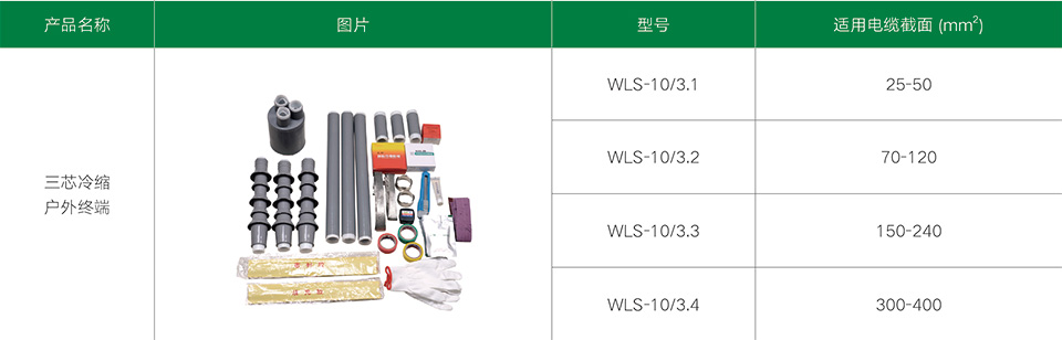 10KV三芯冷縮電纜附件系列產(chǎn)品,適用于3.6/6、6/10、8.7/10、8.7/15kV三芯聚乙烯和交聯(lián)聚乙烯電力電纜。采用液態(tài)硅橡膠制造,集防水、應(yīng)力控制、屏蔽、絕緣于一體。具有良好的電氣性能和機(jī)械性能,能在各種惡劣的環(huán)境條件下長期使用。具有重量輕、安裝方便等優(yōu)點。廣泛地應(yīng)用于電力、石油、化工、冶金、鐵路、港口和建筑等各個領(lǐng)域。