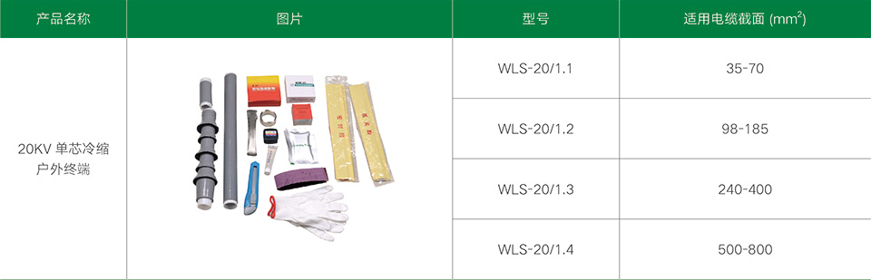 20kV單芯冷縮電纜附件系列產(chǎn)品,適用于12/20、18/24kV單芯聚乙烯和交聯(lián)聚乙烯電力電纜。冷縮電纜附件采用進口液態(tài)硅橡膠材料制造而成,不但具有十分優(yōu)良的電氣性能,而且還具有優(yōu)異的憎水性、高彈性、使用壽命長及恒定的收縮壓力等物理特性。采用冷縮電纜附件,無需明火及特殊工具,只需輕輕抽取塑料支撐條即可,就能自動收縮復(fù)位,安裝非常方便于工作。具有良好的電氣性能和機械性能,能在各種惡劣的環(huán)境條件下長期使用。具有重量輕、安裝方便等優(yōu)點。廣泛地應(yīng)用于電力、石油、化工、冶金、鐵路、港口和建筑各個領(lǐng)域。