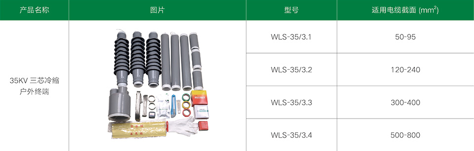35kV三芯冷縮電纜附件系列產(chǎn)品,適用于21/35、26/35kV三芯聚乙烯和交聯(lián)聚乙烯電力電纜。冷縮電纜附件采用進口液態(tài)硅橡膠材料制造而成,不但具有十分優(yōu)良的電氣性能,而且還具有優(yōu)異的憎水性、高彈性、使用壽命長及恒定的收縮壓力等物理特性。采用冷縮電纜附件,無需明火及特殊工具,只需輕輕抽取塑料支撐條即可,就能自動收縮復位,安裝非常方便于工作。具有良好的電氣性能和機械性能,能在各種惡劣的環(huán)境條件下長期使用。具有重量輕、安裝方便等優(yōu)點。廣泛地應(yīng)用于電力、石油、化工、冶金、鐵路、港口和建筑各個領(lǐng)域。