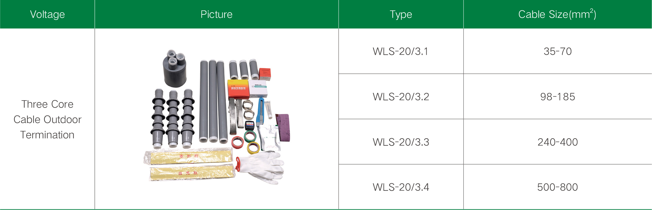 20kV three-core cold shrinkable cable accessory series, suitable for 12/20, 18/24kVSingle-core, three-core polyethylene and cross-linked polyethylene power cables. Cold shrinkable cable accessories are made of imported liquid silicone rubber materials, which not only have very good electrical properties, but also have excellent physical characteristics such as water repellency, high elasticity, long service life and constant shrinkage pressure. Using cold shrinkable cable accessories, no need for open flame and special tools, just gently extract the plastic support strip, can automatically shrink and reset, installation is very convenient for work. It has good electrical and mechanical properties and can be used for a long time under various harsh environmental conditions. It has the advantages of light weight and easy installation. It is widely used in electric power, petroleum, chemical industry, metallurgy, railway, port and construction fields.